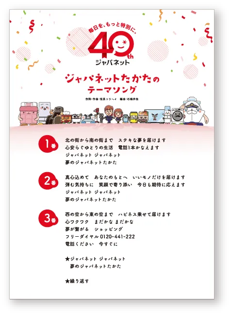 40周年の節目に、『ジャパネットたかたのテーマソング』の歌詞をリニューアル。今の「ジャパネット」を表現した歌詞へ進化しました。特設サイトではオリジナルデザインの歌詞カードを無料配布しております。ご家族やお友達と、みんなで一緒に歌って楽しんでください。