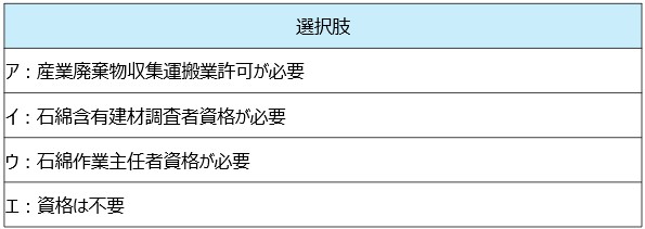 問1. 壁の穴あけ工事における石綿の事前調査書類作成に必要な資格について、正しいものを一つ選んでください。