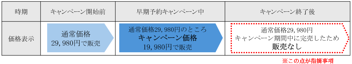2022年、2023年は同キャンペーン終了後に通常価格で販売をしております。2024年も同様の販売計画でしたが、期間内に完売した時点で販売を終了しております。お客様に安くご購入いただける機会を公平に設けており、表示の正当性を失うものではないと考えております。また、早期予約キャンペーンの企画において、キャンペーン終了後に購入できなかったという事実は企画の趣旨に沿ったもので、お客様に誤解を与えてはいないと考えております。