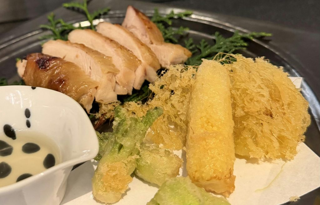 「鶏の麹焼き 季節野菜のビール衣の天ぷら」