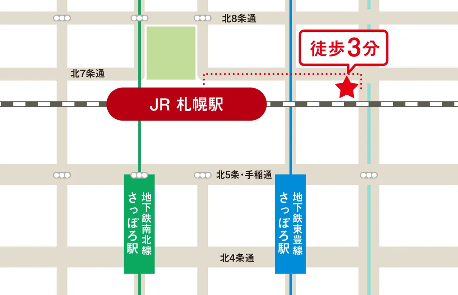 アクセスJR「札幌」駅・札幌市営地下鉄「さっぽろ」駅 徒歩3分